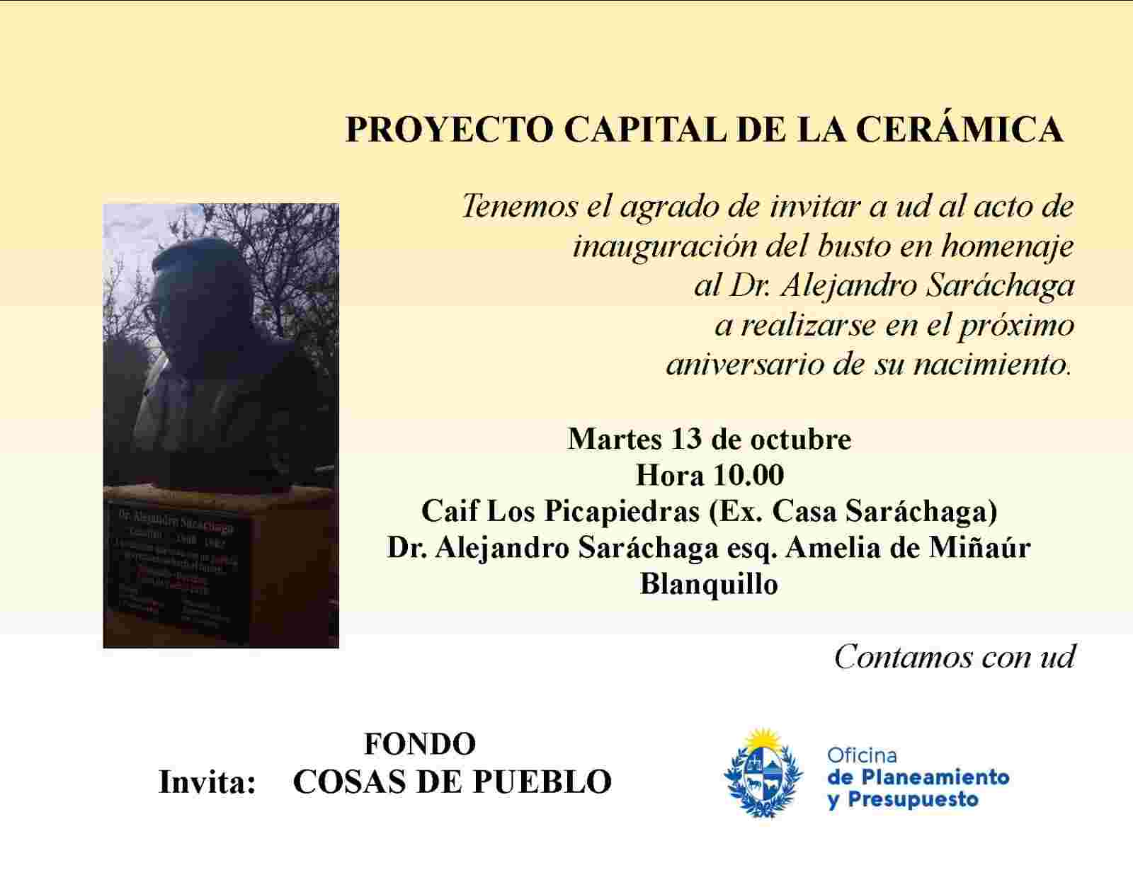 El martes 13 de octubre a la hora 10 se estará inaugurando un busto en homenaje al Dr. Alejandro Saráchaga, será en el Caif «Los Picapiedras» (ex casa Saráchaga) en Blanquillo.