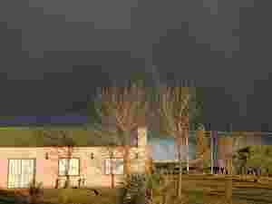 Sobre la tardecita, al frio y al viento le acompañó una tormenta tan breve como sorpresiva, para que se luciera el arco iris por encima de la ciudad.