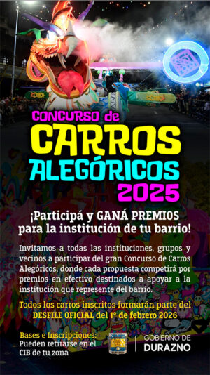 Todos los carros inscritos formarán parte del Desfile Oficial del 1º de febrero de 2026, uno de los momentos más esperados del Carnaval de Durazno.