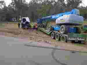 Por causas que se tratan de establecer, el pesado rodado, con chata, que transportaba una grúa, y que circulaba de sur a norte, hizo una especie de tijera quedando sobre faja natural, lado este.