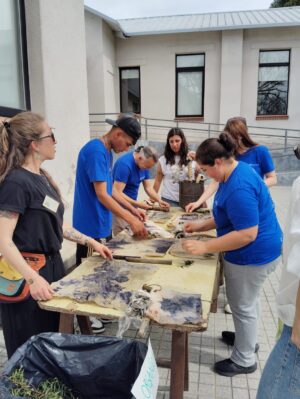 En la propuesta se desarrollaron cinco talleres con temáticas vinculadas al área textil y el teñido de telas con productos vegetales, reciclado de plásticos y su conversión en nuevos productos a través de la termofusión, entre otros.