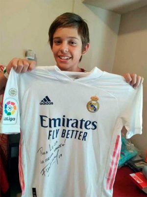 Valverde y Mina Bonino, le mandaron a Luca una camiseta del Real Madrid autografiada y otros regalitos, como botas de fútbol, zapatillas, camisetas y material deportivo para que pueda seguir haciendo lo que más le gusta, el fútbol.”