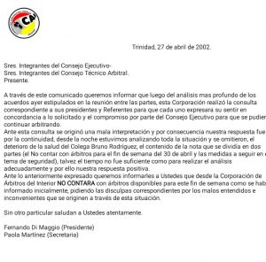 En la misma se adhiere a la Asociación Intergremial de Árbitros de Fútbol (AIAF), ante la agresión del árbitro Bruno Rodríguez, quien ayer tuvo que ser hospitalizado por unas horas y lo enviaron con cinco días de reposo.