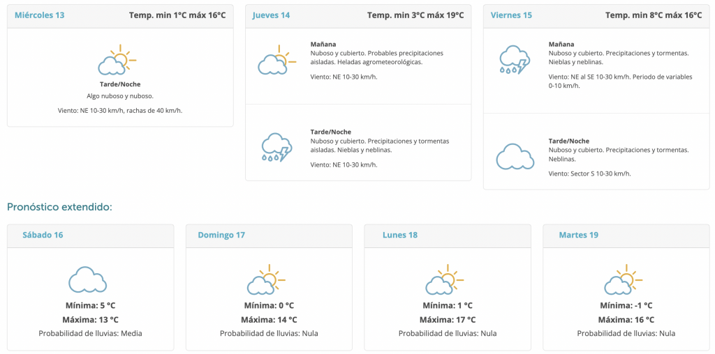 Se espera una nueva desmejora en las condiciones del tiempo con tormentas (algunas puntualmente fuertes) y precipitaciones desde la tarde del jueves 14, comenzando por el litoral oeste y extendiéndose gradualmente hacia el resto del territorio; persistiendo hasta el sábado 16, día en el cual empiezan a mejorar las condiciones del tiempo desde el suroeste.