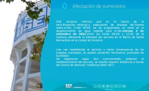 Si bien Durazno Hoy no recibió la comunicación previamente del corte, personas afectadas por la medida señalaron en la mañana de este sábado, que desde las oficinas del Ente les informaron que estarán sin agua por lo menos hasta las 17.00 horas de este sábado.