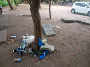 En las fotografías se aprecia la caja vacía, botellas y otros elementos tirados al pie de un árbol y destrozos en bancos.