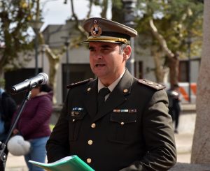Tras el Himno Nacional, la parte oratoria estuvo a cargo del alumno de 6º año de la Escuela Nº85 «Julio Martínez Oyanguren», Luis