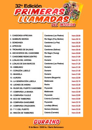 A las 20.00 horas en Batlle y Lavalleja estará saliendo la primera de ellas, estimándose la finalización del desfile para las 2 de la madrugada aproximadamente.