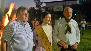 Luego, se procedió al encendido del fogón, un acto simbólico que estuvo a cargo del Intendente, el Arquitecto Hugo Pereda, presidente de la Comisión Organizadora, y la Flor del Pago, quien encendió la llama que iluminará los días de festejo.