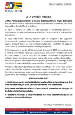 I.- Manifestamos nuestra total solidaridad personal y política, en tanto integrante de la Junta Departamental, de la Sra. Edila Daniela Moreira, ante estos hechos. –